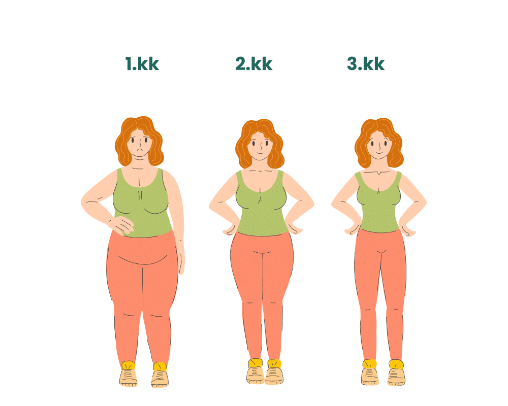 Liian nopeat ratkaisut johtavat yleensä takaisin vanhoihin tapoihin. 52 viikkoa tähtää tasaisiin tuloksiin: paino putoaa 2–5 kg jokainen kuukausi. Se on juuri sopiva tahti, jotta muutokset pysyvät mukana arjessa ja keho ehtii sopeutua.
