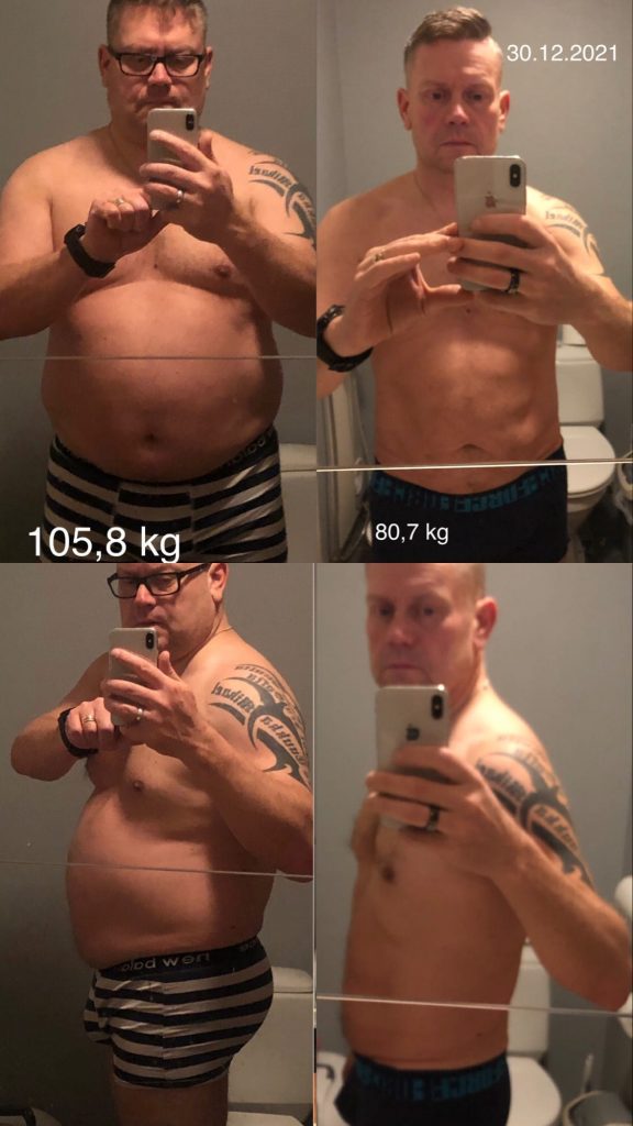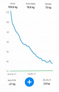 Jarin paino oli tammikuun 2021 alussa 105,8 kiloa. Vyötärön ympärys oli 124 senttimetriä. Nyt paino on 78,8 kiloa ja vyötärön ympärys on 93 senttiä.