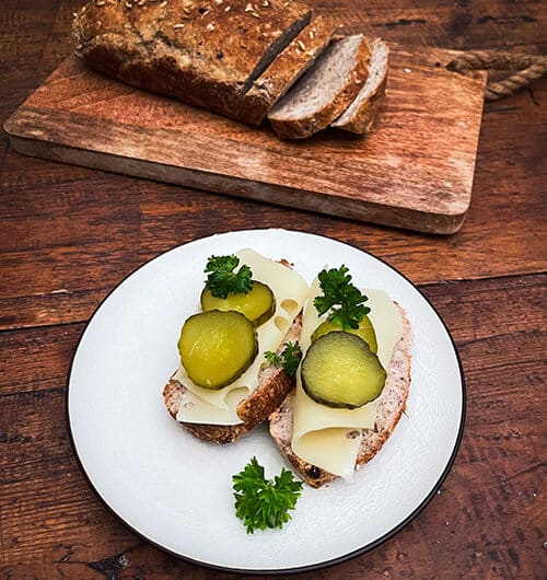 - Syö tällä aterialla 1/4 osa leivästä ja juustosta suolakurkun kanssa.
