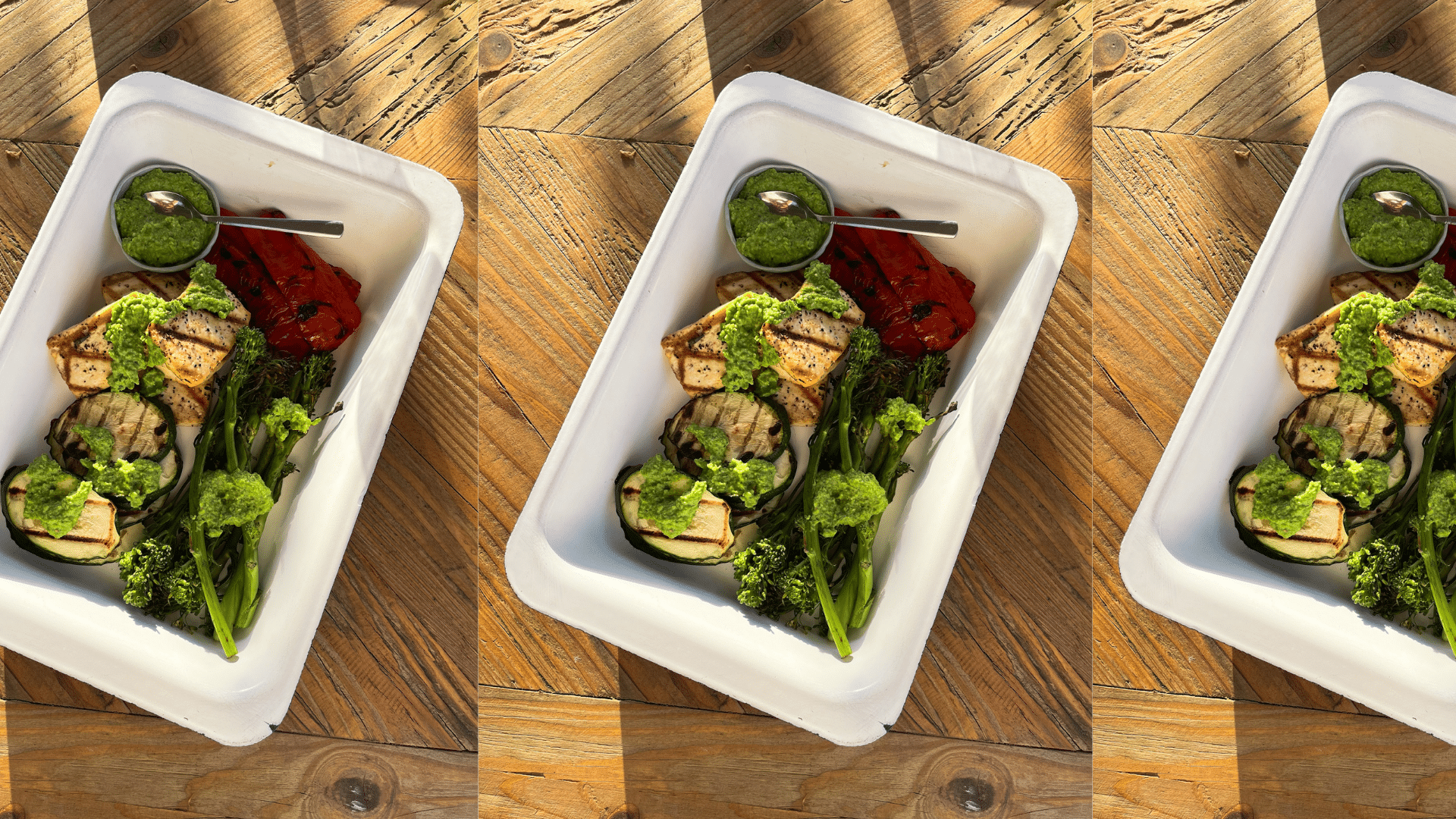 Broccolini, kesäkurpitsa ja paprika sopivat mainiosti grillatun tofun vierelle. Hernepesto tuo kivan raikkauden tähän annokseen.