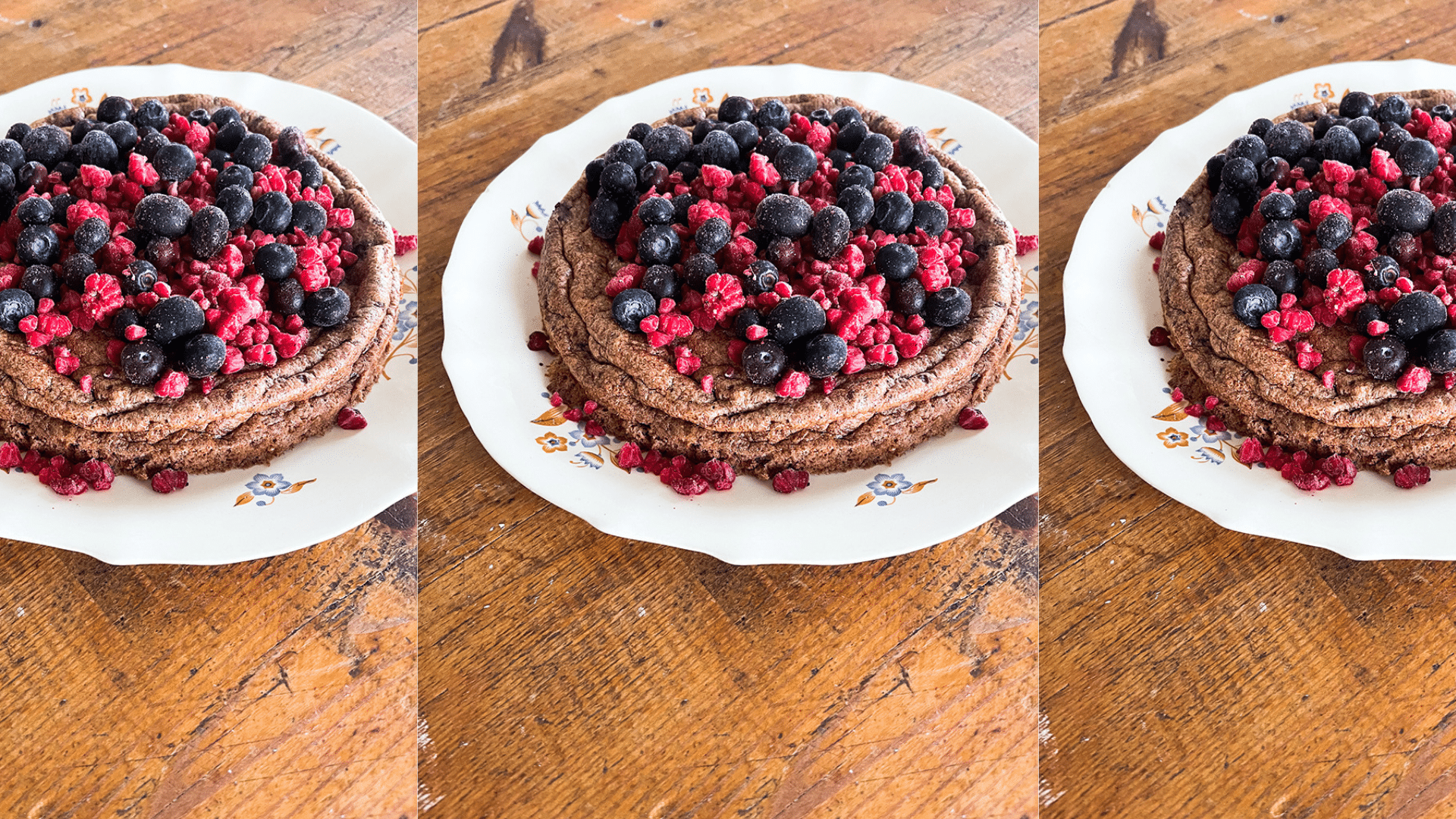 Tämä herkullinen suklaakakku valmistuu kädenkäänteessä. Koristele kakku mieluisilla marjoilla, esimerkiksi pensasmustikoilla ja vadelmilla.