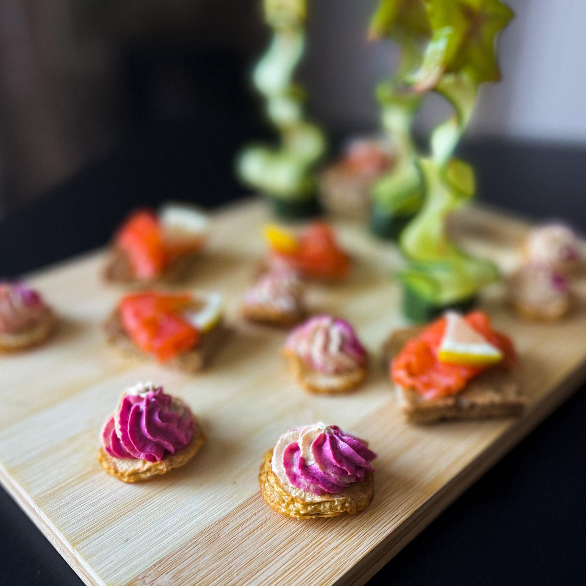 Palsternakkalastut on hyvä pohja alkupaloille. Ihanat rapsakat lastut valmistuvat uunissa kädenkäänteessä. Tofumousse on lihaton ja laktoositon herkku, josta saa pursottamalla näyttäviä alkupaloja juhlaan. Kaksivärinen mousse syntyy, kun lusikoit punajuurella ja sitruunalla maustetut mousset rinnakkain pursotinpussiin.