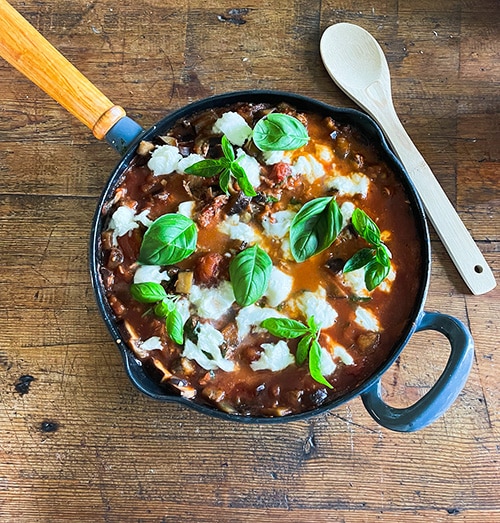 - Anna melanzanen kiehua hiljalleen ilman kantta noin 10 minuuttia välillä sekoitellen. Sekoita joukkoon 1/2 dl hienonnettua basilikaa.