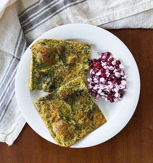 Pinaattipannari on saanut lisää vihreää parsakaalista ja pestosta. Pinaattipannarin kaverina tarjoillaan raejuusto-puolukkaseosta, joka ei makuparina petä koskaan.