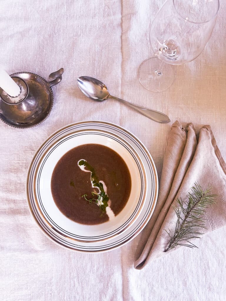 Samettinen punajuurikeitto on ihanan kevyt ja täyteläinen alkuruoka. Keitto kruunataan yrttiöljyllä.