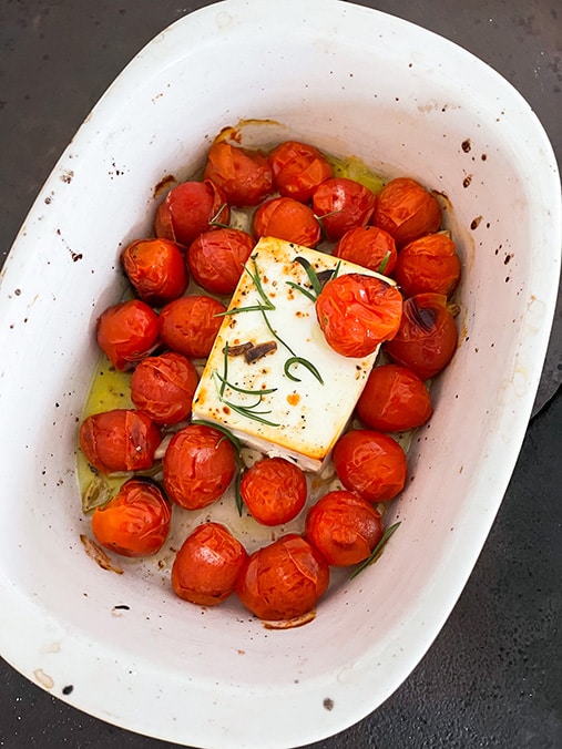 - Laita öljyllä voideltuun uunivuokaan feta ja kaada päälle 20 gl oliiviöljyä