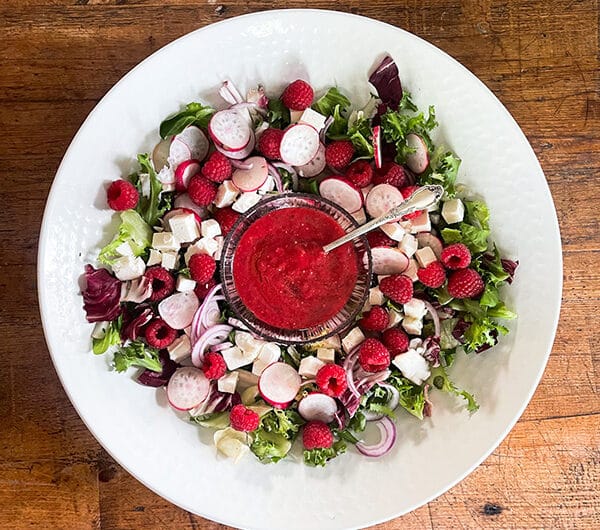 - Revi salaattisekoitus vadille. Levitä päälle vadelmat, retiisit, salaattijuusto ja sipulit. Viimeistele kastikkeella ja pähkinöillä.