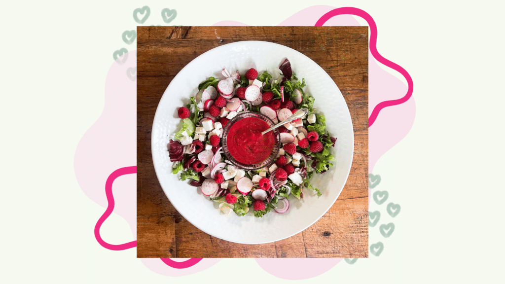 Tässä maukkaassa salaatissa yhdistyy vadelmien raikkaus ja salaattijuuston suolaisuus. Retiisi tuo ihanaa purutuntumaa ja vadelmakastike kruunaa koko salaatin.