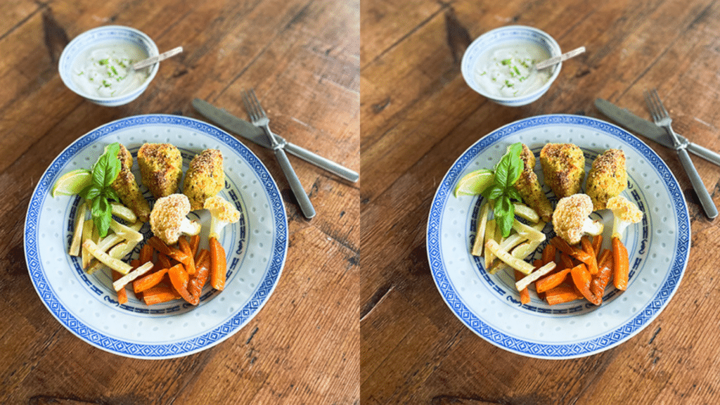 Broilerifileet sekä kukkakaalit saa pintaansa currylla-maustetun paneroinnin sekä kylkeensä maukkaat juuresranskalaiset. Voit dippailla nugetit ja ranskikset limen makuiseen jogurttikastikkeeseen.