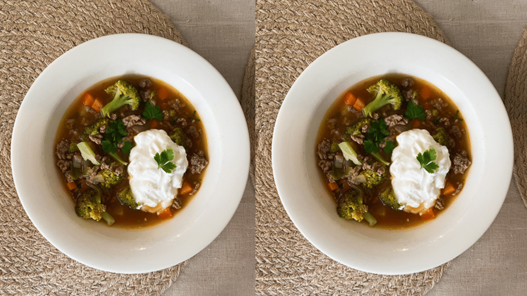 Tämä jauhelihakeitto on nopea valmistaa. Tomaattipyre ja smetana tuo kivaa tvistiä perinteiseen jauhelihakeittoon verrattuna.