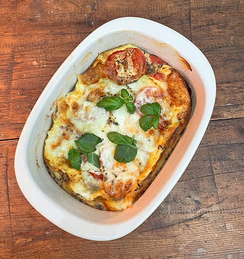 - Kaada munakastaikina vuokaan. Ripottele vuokaan tomaatin puolikkaat ja päälle mozzarellaviipaleet.