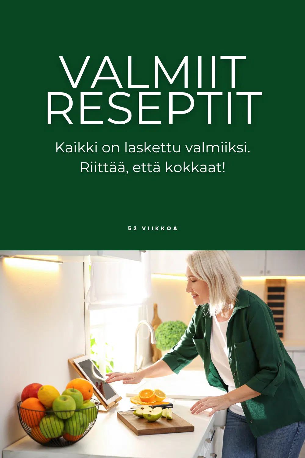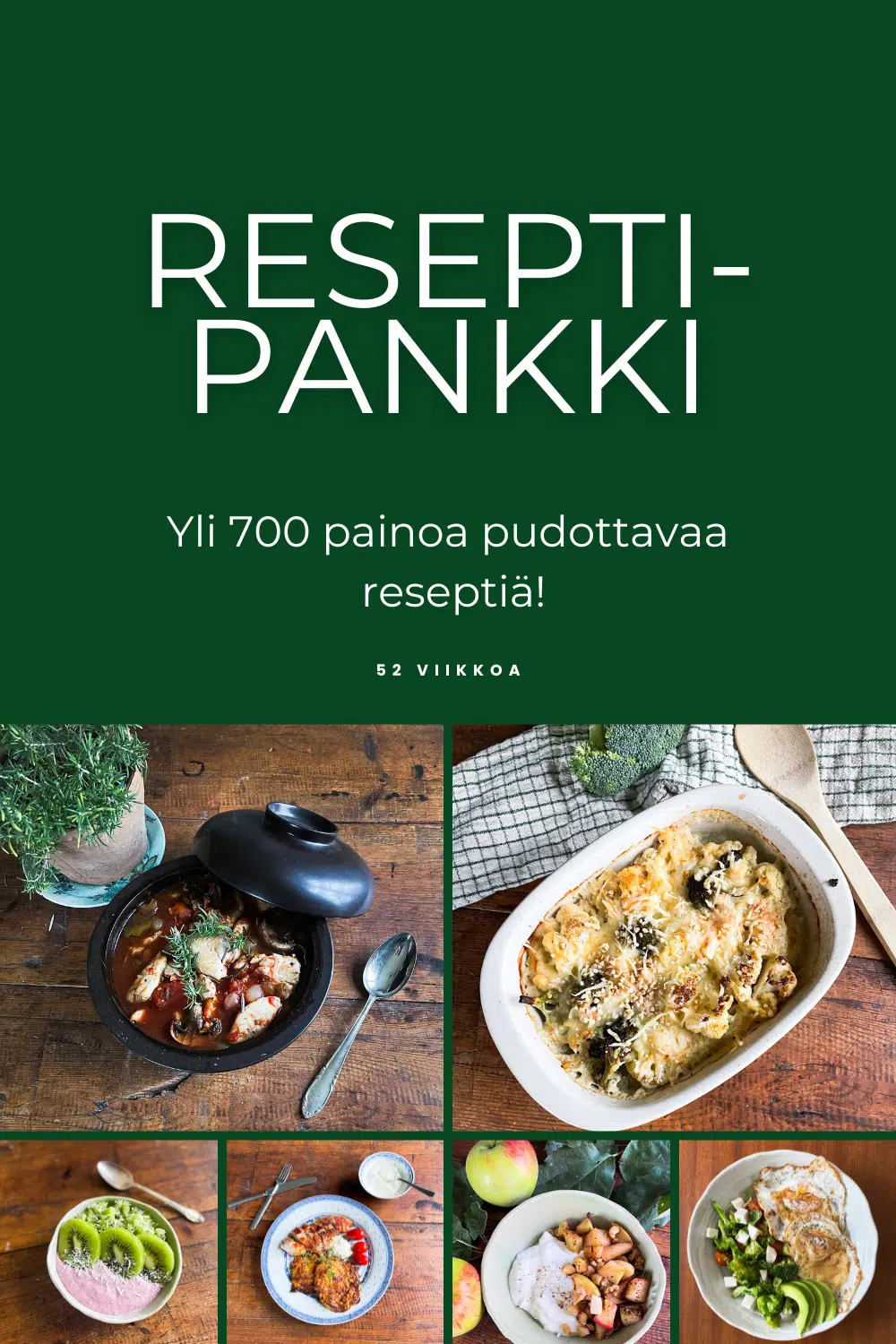 52 viikon reseptipankista löytyy reseptit joka tilanteeseen. Saat aamupalat, iltapalat, keitot ja salaatit.