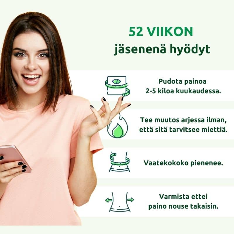 52 viikkoa on ollut itselle helppo tapa laihduttaa tasaisesti. Olen syönyt näiden ohjeiden mukaisia ruokia ja painoa vain putoaa itsestään. Se on tuntunut tosi palkitsevalta ja parantanut itsetuntoa, kun vihdoin onnistuu ja vielä näin helposti!