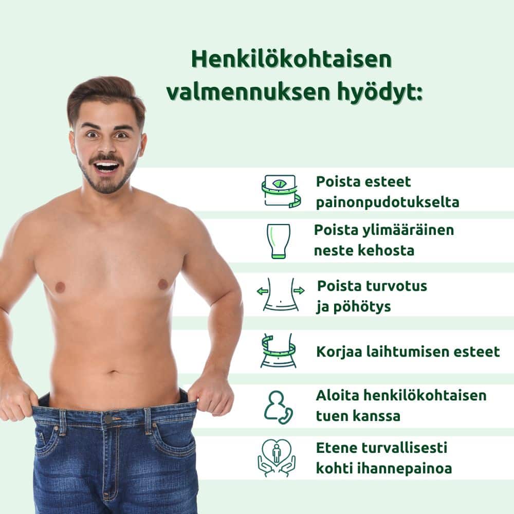 Valmennuksen alussa toteutetaan kattava alkukartoitus, jonka avulla kartoitetaan nykyinen terveydentilasi, ruokailutottumuksesi, elämäntapasi sekä mahdolliset erityistarpeet tai haasteet.